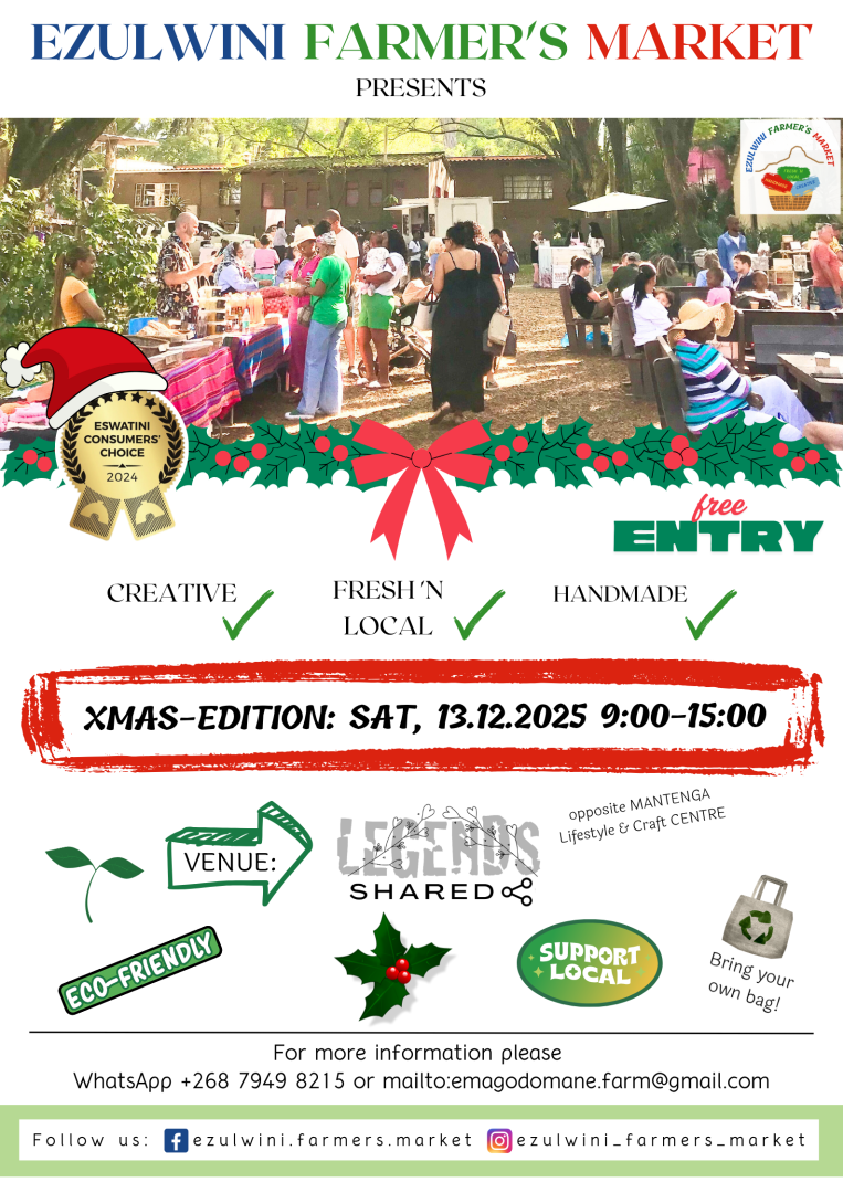 Join us for the Xmas-Edition of the Ezulwini Farmer's Market, where you can find a variety of fresh, organic produce and handmade goods from creative and local producers.